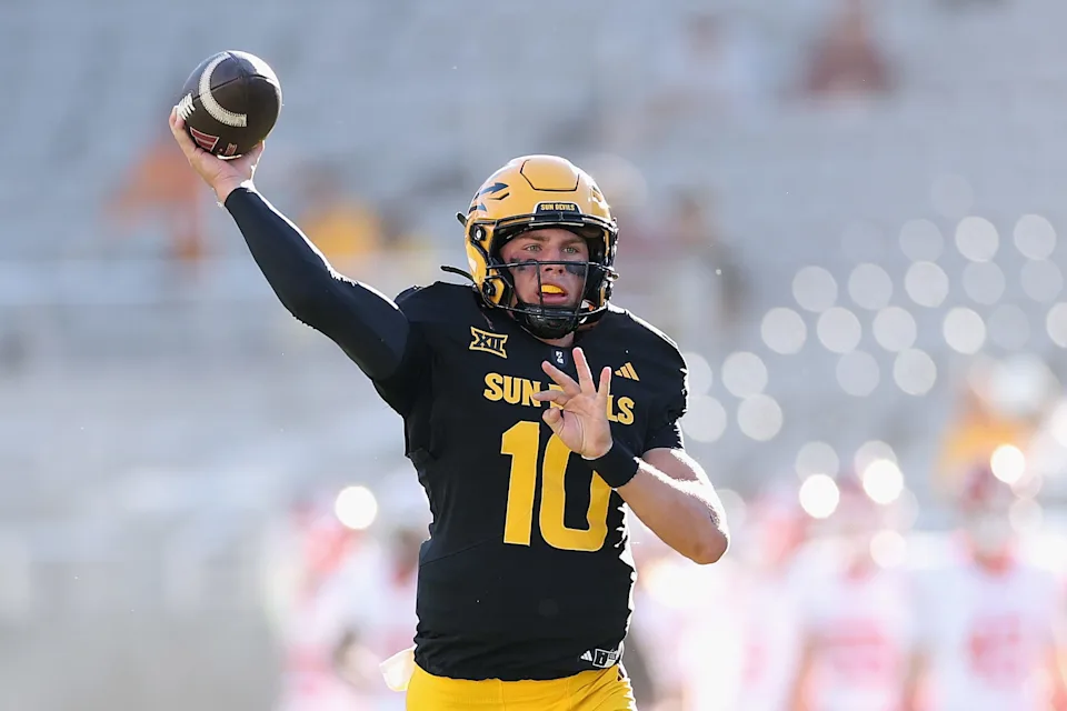 TEMPE, ARIZONA – 25 OKTOBER: Sam Leavitt # 10 dari Arizona State Sunlight Devils melakukan pemanasan sebelum pertandingan NCAAF di Hill America Arena pada 25 Oktober 2025 di Tempe, Arizona. Cougars mengalahkan Setan Matahari 24 – 16 (Foto oleh Christian Petersen/Getty Images)