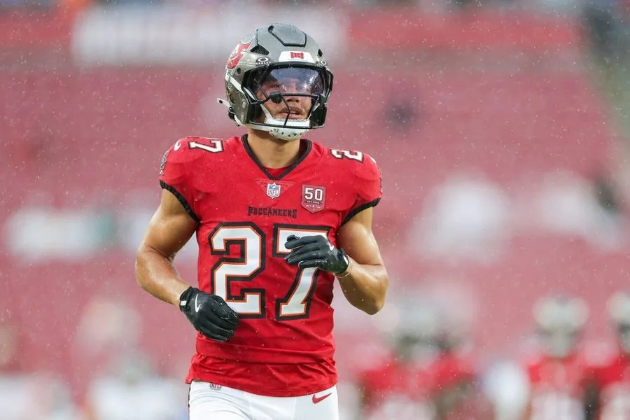 9 Agustus 2025; Tampa, Florida, AS; Cornerback Tampa Bay Buccaneers Zyon McCollum (27) memanas sebelum pertandingan pramusim melawan Tennessee Titans di Stadion Raymond James. Kredit Wajib: Nathan Ray Seebeck-Imagn Images