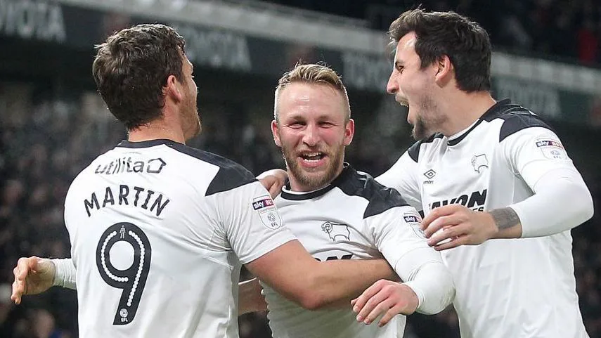 Mantan penyerang Derby County Johnny Russell merayakan Derby County pada tahun 2017 (Getty Images)