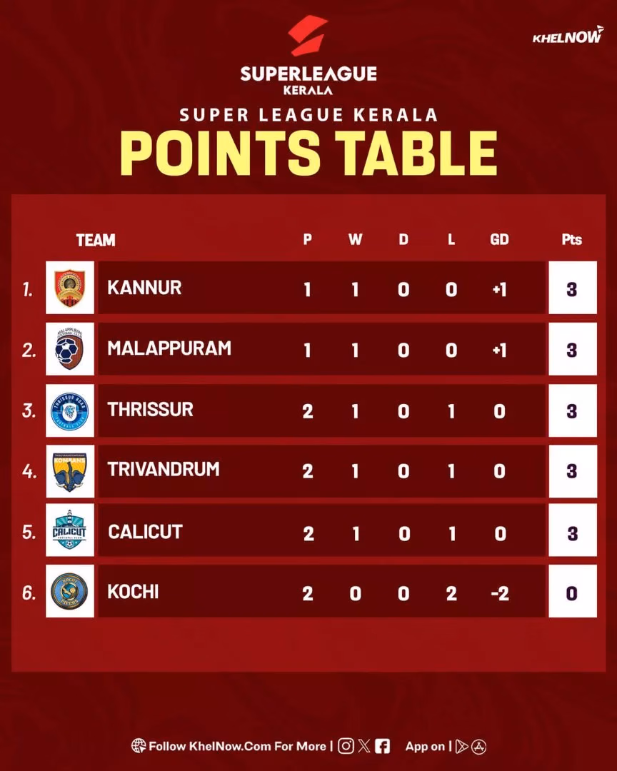 Kannur dan Malappuram berada di puncak dengan selisih gol positif dan akan saling berhadapan besok. Akan menarik untuk melihat bagaimana tim bermain selanjutnya seiring dengan semakin serunya Liga Super Kerala
