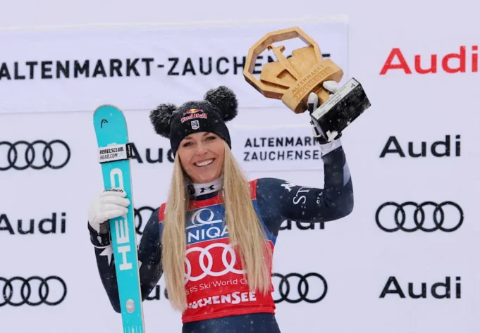 Lindsey Vonn dari Amerika Serikat merayakan di podium setelah memenangkan perlombaan ski alpine menuruni bukit putri di Piala Dunia FIS di Zauchensee. Kredit Wajib: Leonhard Foeger/Reuters melalui Imagne Images