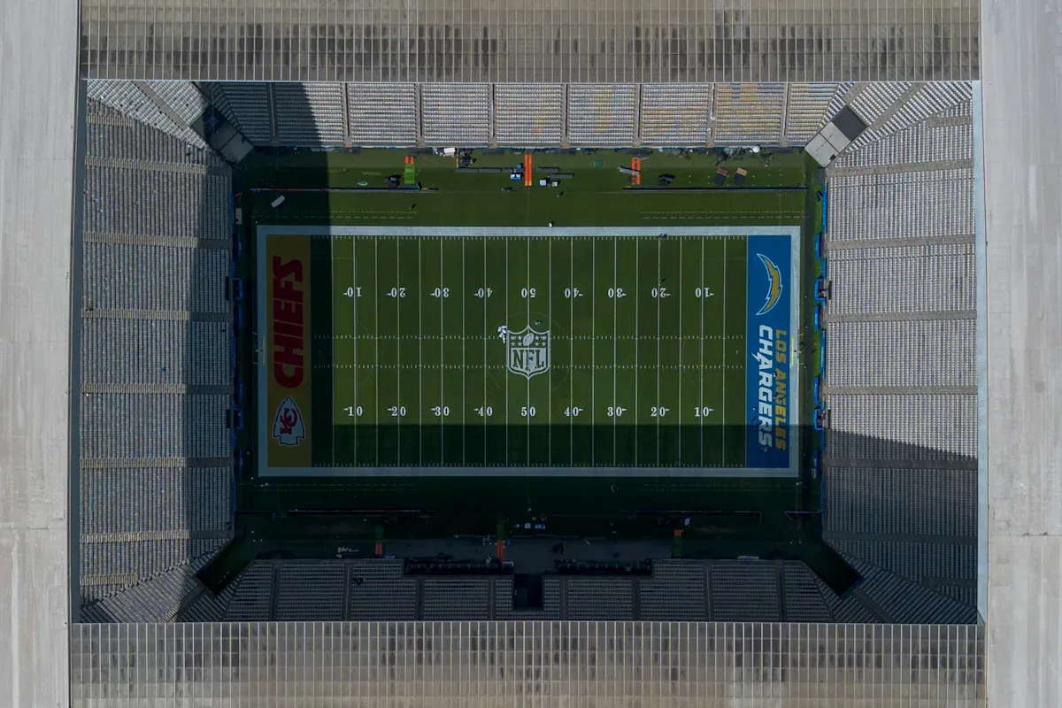 Itu tidak terjadi untuk permainan tahun ini, karena bidang ini lebih mirip dengan super Bowl daripada pertarungan minggu 1 Dalam pertandingan tahun lalu, Eagles mendapatkan perawatan tim rumah sejati dengan kedua zona akhir yang ditutupi dengan hijau, putih dan hitam tradisional Philly. Penggemar Chargers memperhatikan media sosial setelah komentator NFL Kay Adams memposting bidikan lapangan untuk pertandingan hari Jumat.