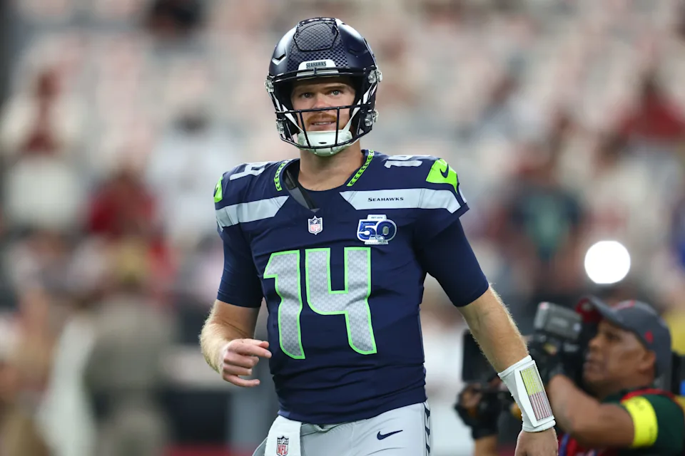 Quarterback Seattle Seahawks Sam Darnold (14) tampil sebelum pertandingan melawan Arizona Cardinals di State Farm Stadium.