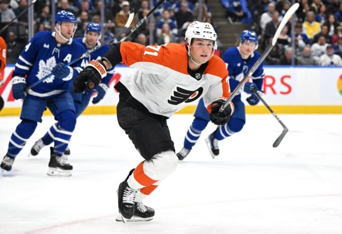 25 Maret 2025; Toronto, Ontario, BISA; Penyerang Philadelphia Flyers Tyson Foerster (71 melanjutkan permainan melawan Toronto Maple Leafs pada periode kedua di Scotiabank Arena. Kredit Wajib: Dan Hamilton-Imagne Images