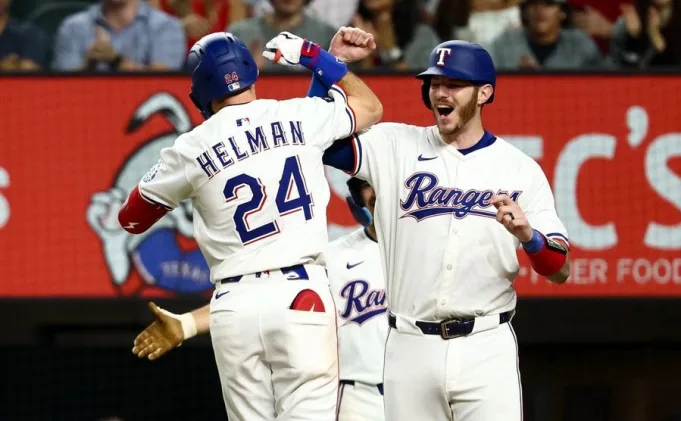 Rangers merespons di bagian bawah bingkai, sebagai homer kedua Helman di malam-malam sebanyak juga menjadwalkan Jonah Heim, yang telah berjalan, dan mengikat permainan di 3 – 3