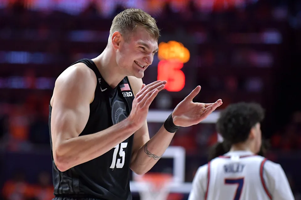 15 Februari 2025; Kampanye, Illinois, AS; Center Michigan State Spartans Carson Cooper (15) bereaksi setelah menang atas Illinois Fighting Illini di State Farm Center. Kredit Wajib: Gambar Ron Johnson-Imagne