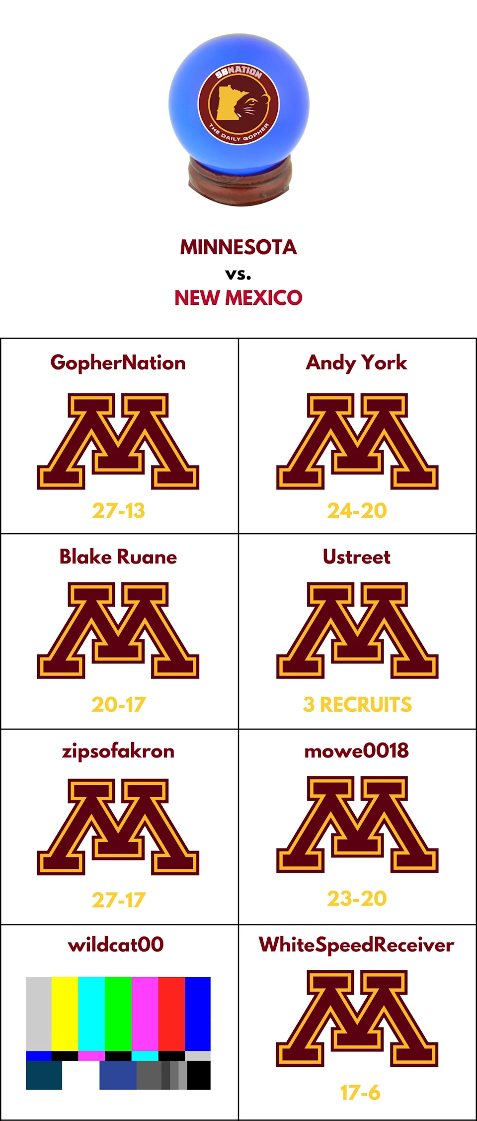 gopherguy 05 : Pukulan manakah yang lebih kuat: PJ Fleck dan Minnesota memenangkan setiap pertandingan bowling yang mereka mainkan, atau Gophers tidak mampu menang di Stadion Huntington Financial institution? Saya akan mengambil yang pertama, karena tampaknya sebagian besar pertahanan akan bermain, dan kombo Darius Taylor/Drake Lindsey sudah cukup untuk memperpanjang rekor kemenangan beruntun melawan tim New Mexico yang bagus.
