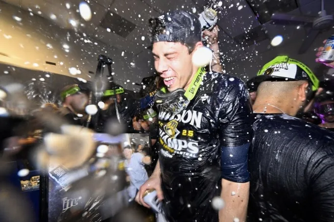 MLB: Milwaukee Brewers di St. Louis Cardinals21 Sep 2025; St. Louis, Missouri, AS; Milwaukee Brewers meninggalkan fielder Christian Yelich (22) dihujani bir dan sampanye setelah Brewers meraih kejuaraan Divisi Pusat Liga Nasional 2025 setelah pertandingan melawan St. Louis Cardinals di Stadion Busch. Kredit Wajib: Gambar Jeff Curry-Imagn