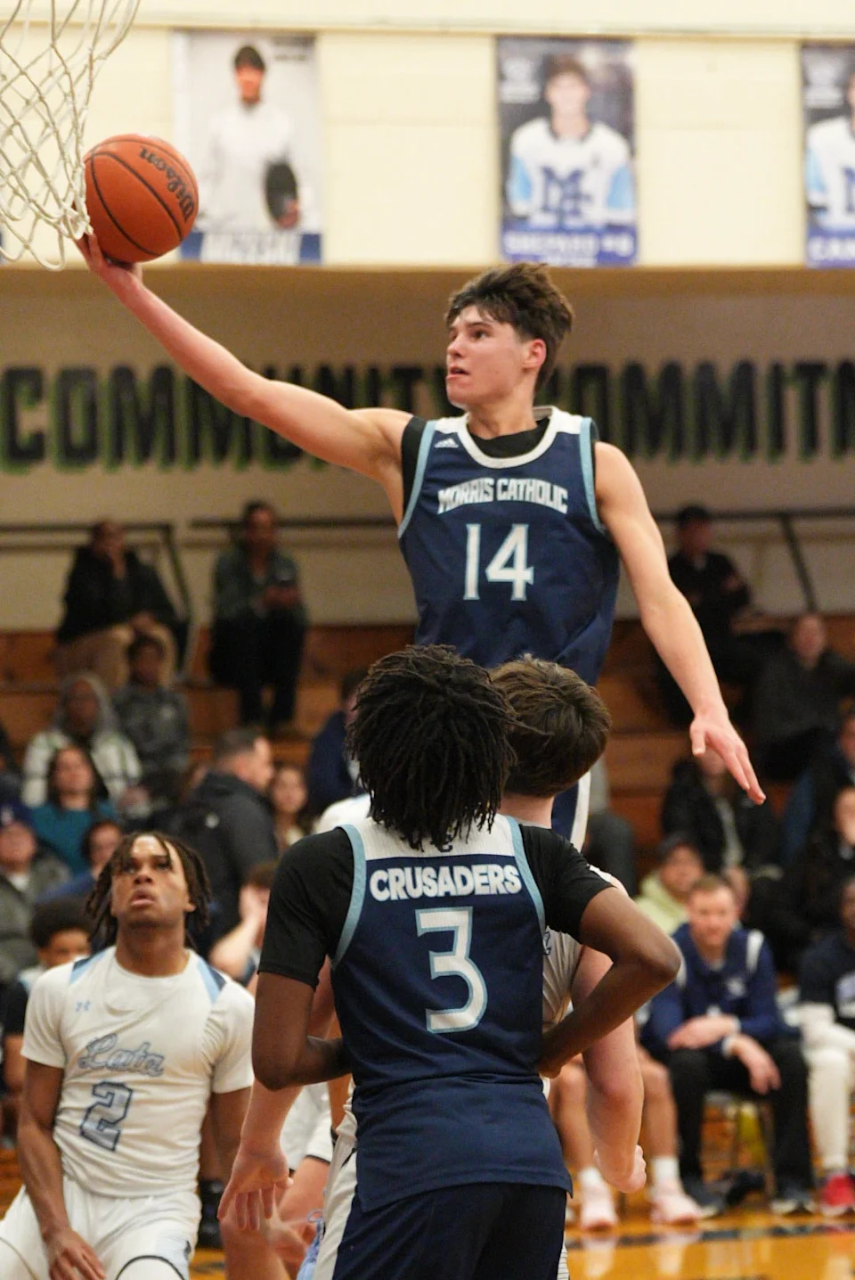 20 Februari 2025; Denville, NJ, AS; Bola basket putra Immaculata di Morris Catholic. MC # 14 Austin Workman berkendara ke keranjang.