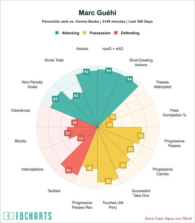 Model rekrutmen Liverpool yang berdasarkan data sangat menekankan pada pemain bertahan yang dapat beroperasi dalam sistem lini atas sambil tetap tenang di bawah tekanan. Guehi secara konsisten mendapat nilai bagus di seluruh metrik tersebut, membuatnya sangat cocok secara gaya.