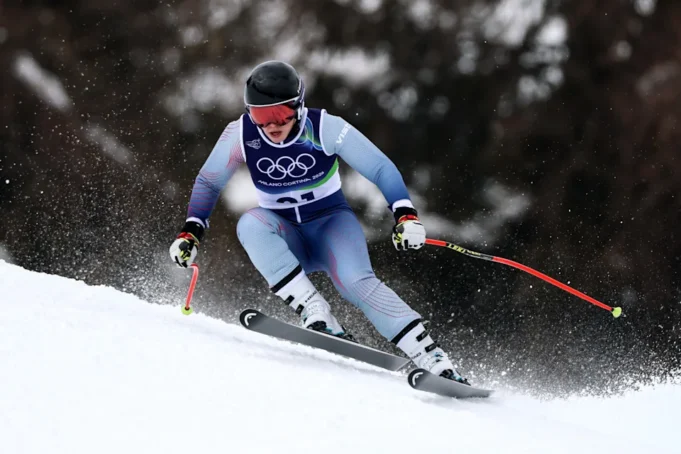 Julia Pleshkova dari Tim AIN bermain ski selama latihan Downhill Wanita pada hari nol Olimpiade Musim Dingin Milano Cortina 2026
