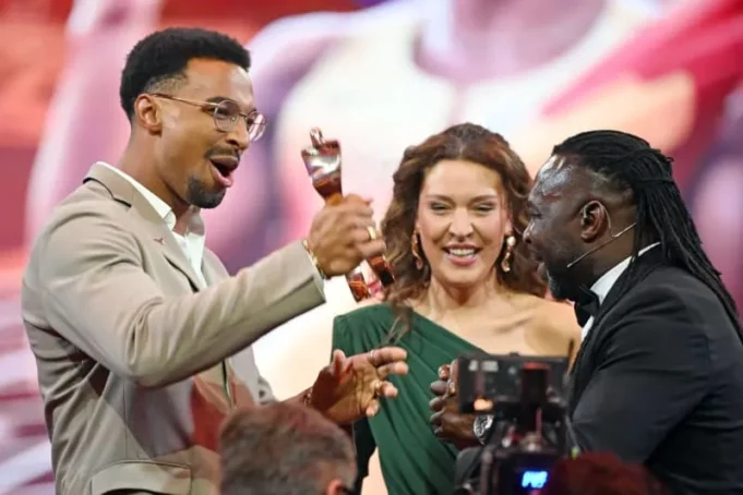 Atlet decathlet Jerman Leo Neugebauer (Kiri) diberi penghargaan oleh ayahnya sebagai Athlete of the Year 2025 pada acara Sportsperson of the Year 2025 di Kurhaus Baden-Baden. Uli Dek/dpa