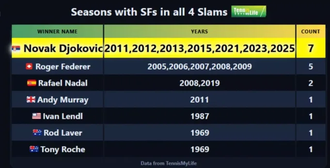 Dengan kemenangan itu, Djokovic sekarang memiliki tujuh musim di mana ia mencapai semifinal dari keempat Grand Slams- 2011, 2012, 2013, 2015, 2021, 2023, dan 2025 Roger Federer berada di peringkat kedua dalam daftar elit ini dengan lima musim tersebut.
