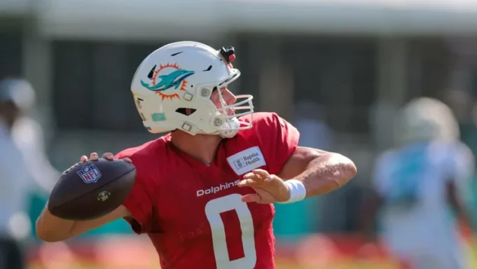 Quarterback Miami Dolphins Zach Wilson (0) melakukan lemparan selama latihan kamp pelatihan di Kompleks Pelatihan Kesehatan Baptist di Miami Gardens pada 29 Juli 2025, bekerja melalui repetisi saat pelatih mengevaluasi waktu dan mekanisme. Wilson bersepeda melalui lemparan terstruktur dan gerakan saat Miami mempersiapkan ruang quarterback untuk kompetisi pramusim. Kredit Wajib: Gambar Sam Navarro-Imagne