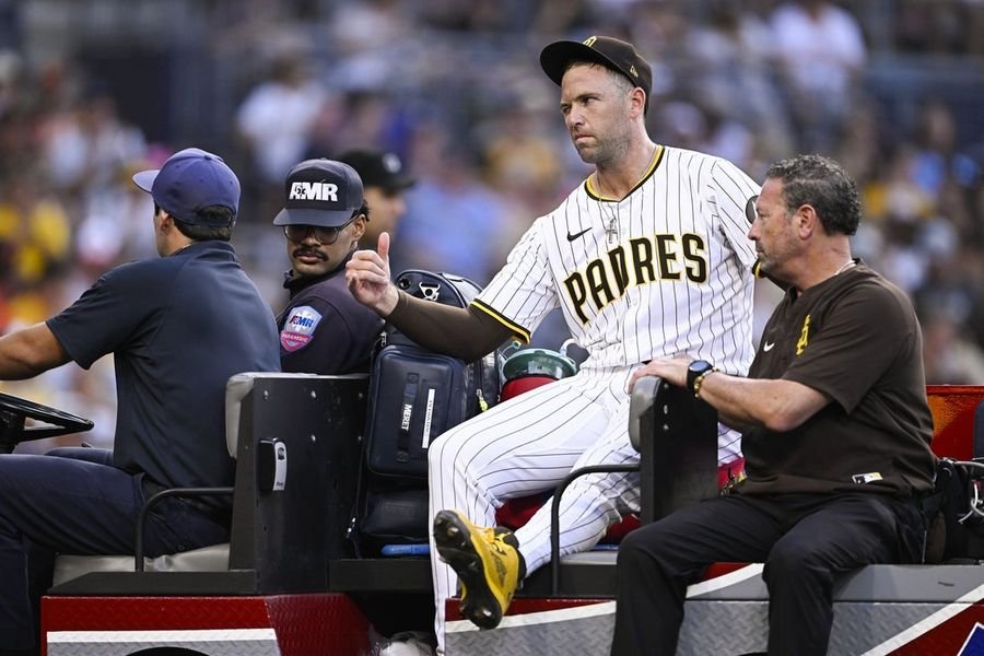 Reliever All-Star San Diego Padres Jason Adam jatuh ke permukaan gundukan Senin malam dan harus diangkut dari lapangan setelah mencoba menurunkan bola tanah di puncak inning ketujuh melawan orioles Baltimore.