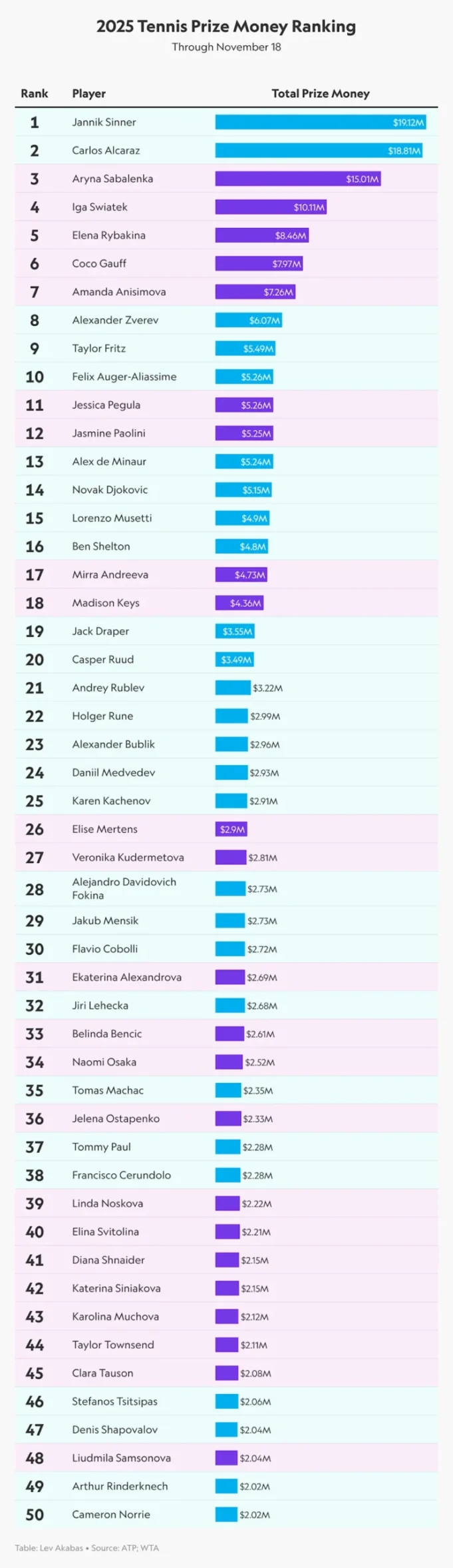 Dengan selesainya musim 2025, wanita menempati lima dari delapan tempat teratas dalam peringkat hadiah uang. Sinner dan Alcaraz begitu dominan musim ini sehingga sulit bagi pemain lain untuk memisahkan diri dari pemain lainnya.
