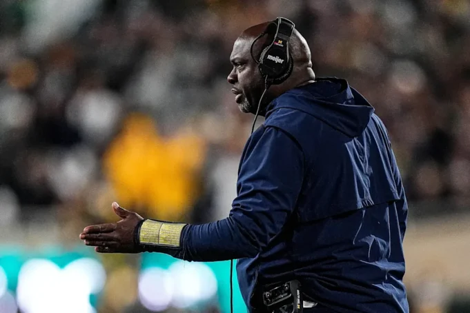 Pelatih punggung Michigan Tony Alford berbicara dengan para pemain sebelum pertandingan melawan Michigan State pada babak pertama di Stadion Spartan di East Lansing pada Sabtu, 25 Oktober 2025