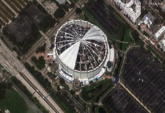 Atap Tropicana Field, markas tim MLB Tampa Bay Rays, terkoyak oleh angin kencang Badai Milton. Citra satelit dari Maxar menunjukkan kehancuran pada 10 Oktober 2024 Sebelum mendarat, stadion tersebut diubah menjadi base camp untuk petugas tanggap darurat.