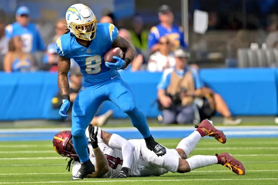 5 Oktober 2025; Inglewood, Kalifornia, AS; Los Angeles Chargers yang berlari kembali Omarion Hampton (8) melepaskan diri dari gelandang Washington Commanders Frankie Luvu (4) saat ia membawa bola di Stadion SoFi. Kredit Wajib: Gambar Jayne Kamin-Oncea-Imagne
