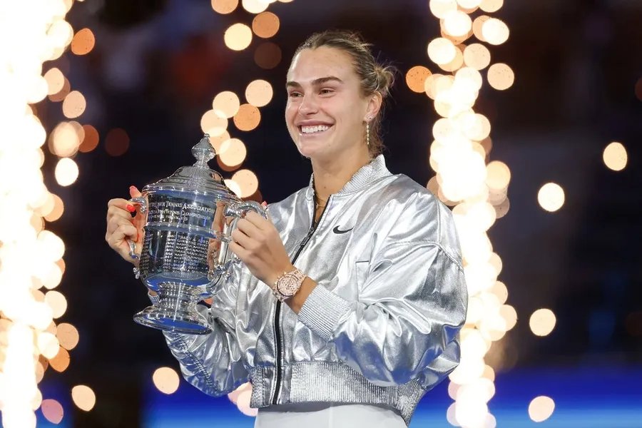 6 September 2025; Pembilasan, NY, AS; Aryna Sabalenka merayakan trofi juara setelah memenangkan final tunggal putri melawan Amanda Anisimova (AS) (tidak digambarkan) kejuaraan tenis AS Terbuka 2025 di Pusat Tenis Nasional Billie Jean King. Kredit Wajib: Gambar Mike Frey-Imagne