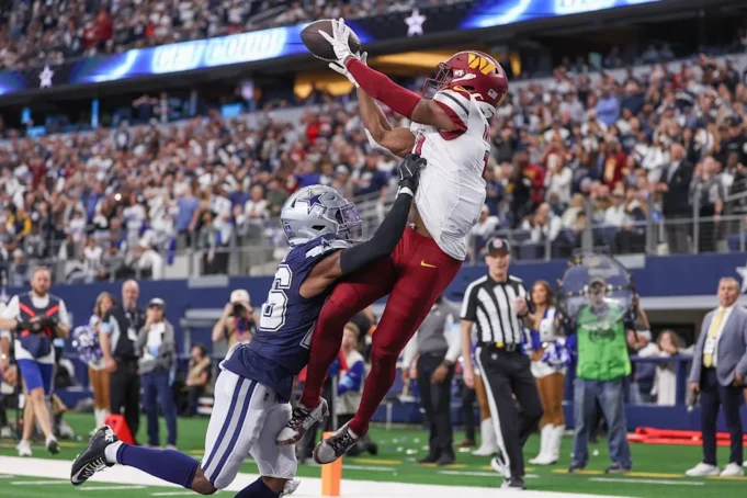 Terry McLaurin # 17 dari Washington Commanders mencetak goal penerimaan melawan DaRon Bland # 26 dari Dallas Cowboys di AT&T Arena pada tanggal 05 Januari 2025 di Arlington, Texas.