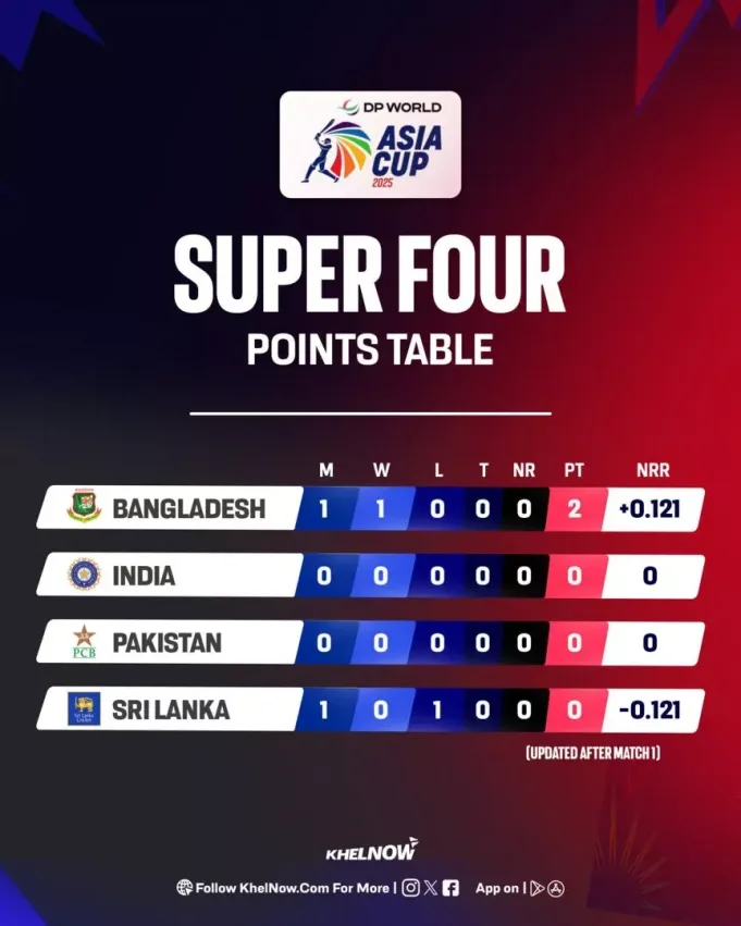 Setelah pertandingan pertama dari tahap Super Four Piala Asia 2025, Bangladesh berada di bagian atas tabel poin dengan dua poin dan laju run net (NRR) 0,121. Sri Lanka berada di urutan kedua dengan satu kekalahan, sementara India dan Pakistan belum bermain.