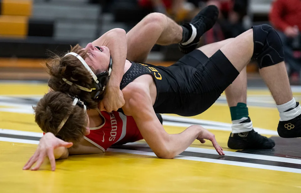 Ezra Swartley dari Souderton menghadapi Dale Wetherill dari Central Bucks West dalam pertandingan gulat Suburban One League Colonial Championship seberat 121 pon di Doylestown pada Selasa, 11 Februari 2025.