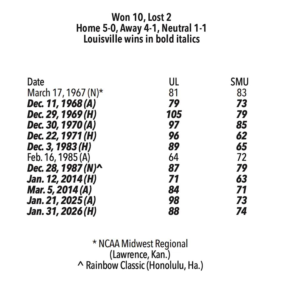 Hanya dua setengah minggu sejak Louisville mengakhiri bulan Januari dengan kemenangan kandang 88 – 74 atas SMU dalam pertandingan dimana Cardinals tertinggal tiga di babak pertama. Mustang telah unggul 2 – 2 sejak itu, mengalahkan Pitt dan Notre Dame tetapi kalah dalam sepasang video game 1 poin dari NC State dan Syracuse.