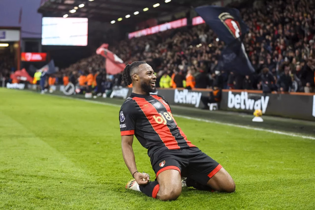 BOURNEMOUTH, INGGRIS – 25 JANUARI: Antoine Semenyo dari Bournemouth melakukan selebrasi setelah mencetak gol untuk mengubah skor menjadi 5-0 dalam pertandingan Premier League antara AFC Bournemouth dan Nottingham Forest FC di Vitality Stadium pada 25 Januari 2025 di Bournemouth, Inggris. (Foto oleh Robin Jones – AFC Bournemouth/AFC Bournemouth melalui Getty Images)