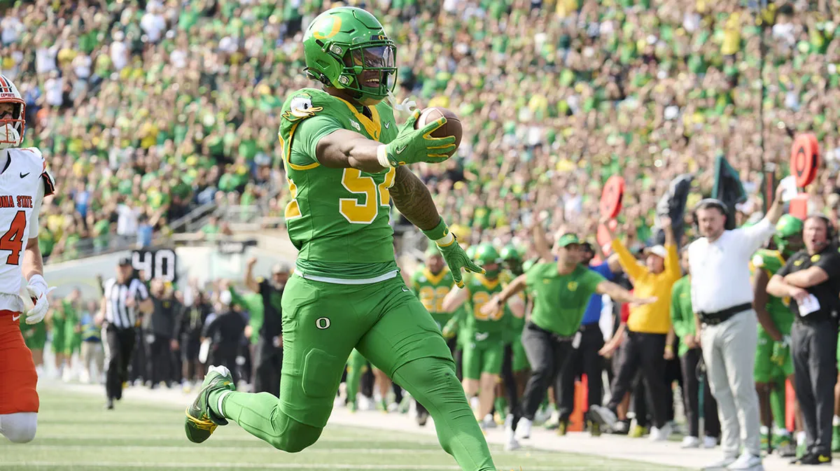 Sementara Oregon juga unggul 5 -0. Setelah kemenangan pembukaan atas Montana State, Ducks membantu mengakhiri period Mike Gundy di Oklahoma State, menang 69 – 3 Oregon memulai perjalanannya untuk pertama kalinya di Minggu ke- 3, mengalahkan Northwestern di pembuka konferensinya. Setelah menang atas Oregon State dan Penn State, Ducks menjalani pertandingan pembuka konferensi mereka melawan Indiana.