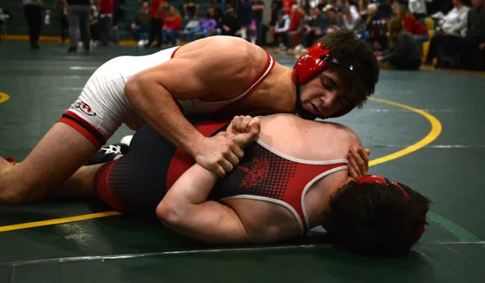 Max Banas dari New Boston Huron mengendalikan Dino Gessner dari Jefferson di last Turnamen Liga Huron seberat 113 pon pada Sabtu, 7 Februari 2026 Banas menang dengan keputusan besar.