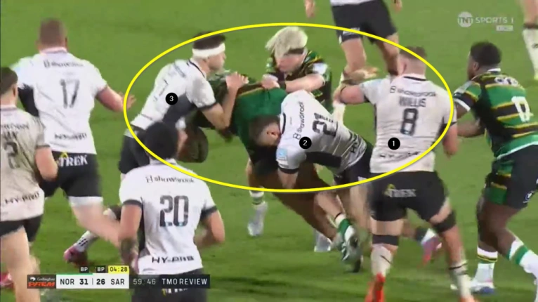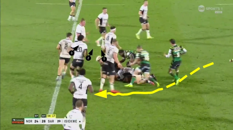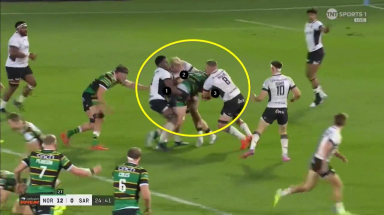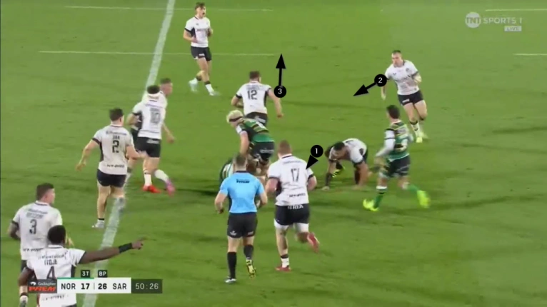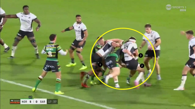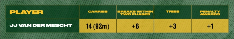 Pria asal Pretoria ini membawa jarak tempuh paling jauh dari penyerang mana pun kecuali Pollock. Sebenarnya, ia tidak melakukan break bersih atau melakukan tekel, namun jumlah keunggulan menyerang yang didapat dari larinya yang kuat sungguh menakjubkan. Carry-nya di gambar terakhir dari tiga tangkapan layar membuka ruang bagi bek sayap George Hendy untuk berlari dan pergerakan tersebut diselesaikan dengan baik oleh Pearson di bawah bayang-bayang tiang gawang Saracens.