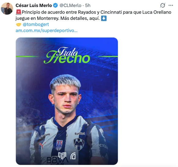 Rayados telah mencapai kesepakatan awal dengan FC Cincinnati untuk transfer Luca Orellano, pemain sayap berbakat Argentina yang bersinar di musim MLS lalu.