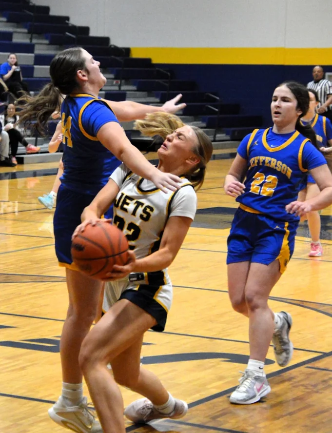 Sophia Mator dari Bandara dilanggar oleh Emi Grube dari Jefferson saat kemenangan Bandara 73 – 21 pada Senin, 9 Februari 2026