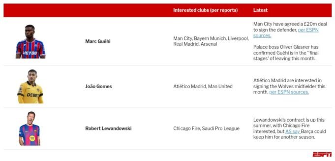 – Striker Republik Irlandia Evan Ferguson ada dalam daftar pilihan musim dingin Napoli, Corriere dello Sport laporan. Pemain berusia 21 tahun, yang dipinjamkan ke AS Roma dari Brighton & Hove Albion musim ini, mungkin akan pindah lagi, dengan Napoli sedang mencari penyerang baru bulan ini. Ferguson memiliki lima keterlibatan gol dalam 16 pertandingan liga musim ini. Sementara itu, Nicolo Schira melaporkan bahwa Chelsea telah menawarkan Napoli kesempatan untuk menandatangani kontrak Raheem Sterling yang tidak masuk dalam rencana klub karena dibekukan sepanjang musim.
