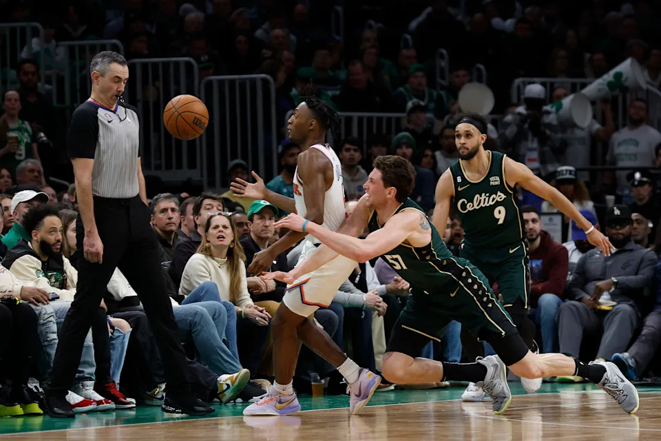 5 Maret 2023; Boston, Massachusetts, AS; Center Boston Celtics Mike Muscala (57 tidak bisa mendapatkan bola lepas di sekitar guard New York Knicks Immanuel Quickley (5 saat wasit Brett Nansel (44 mengawasi selama kuarter kedua di TD Yard. Kredit Wajib: Winslow Townson-USA TODAY Sports