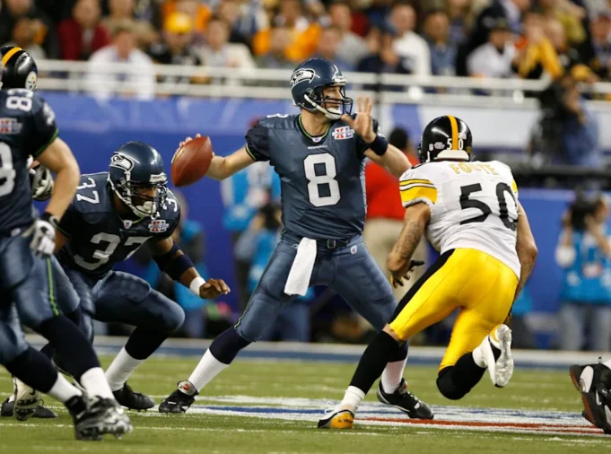 5 Februari 2006; Detroit, MI, AS; Quarterback Seattle Seahawks (8 Matt Hasselbeck melewati tekanan dari gelandang Pittsburgh Steelers (50 Larry Foote pada kuarter pertama Super Dish XL di Ford Area. Foto: Matthew Emmons-USA TODAY Olahraga Hak Cipta © 2006 Matthew Emmons