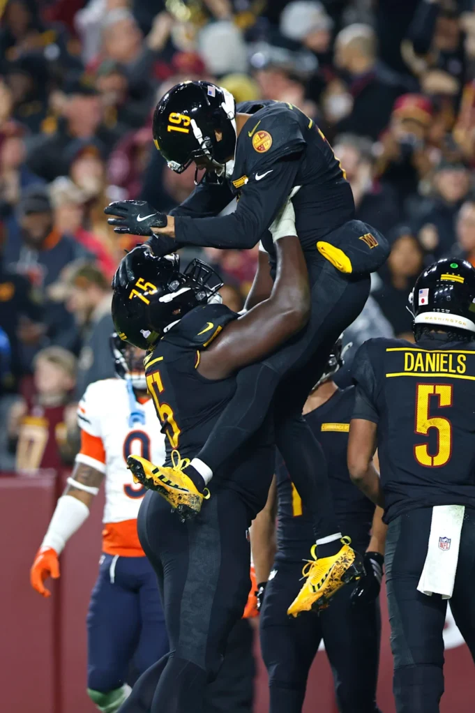 Minggu 6: Penerima lebar Washington Commanders Chris Moore (19) merayakan dengan rekan satu tim setelah mencetak touchdown selama pertandingan “Monday Night Football” melawan Chicago Bears di Northwest Stadium. Para Komandan mengenakan seragam alternatif serba hitam untuk pertandingan tersebut.