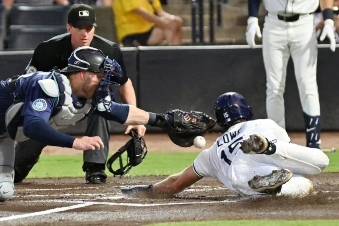 MLB: Seattle Mariners di Tampa Bay Rays 3 Sep 2025; St. Petersburg, Florida, AS; Tampa Fl Bay Rays Fielder kanan Josh Lowe (15 meluncur melewati penangkap Seattle Mariners Mitch Garver (18 untuk mencetak lari di inning pertama di bidang George M. Steinbrenner. Kredit Wajib: Gambar Jonathan Dyer-Imagn