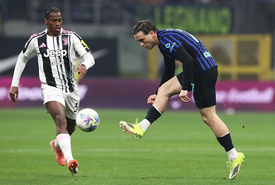 MILAN, ITALIA– 14 FEBRUARI: Piotr Zielinski dari FC Internazionale Milano mendapat tekanan dari Jonathan David dari Juventus selama pertandingan Serie A antara FC Internazionale dan Juventus FC di Stadion Giuseppe Meazza pada 14 Februari 2026 di Milan, Italia. (Foto oleh Marco Luzzani/Getty Images)
