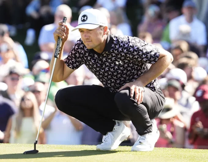 Jordan Spieth memeriksa puttnya di hole kedua pada putaran kedua WM Phoenix Open 2026 di TPC Scottsdale.