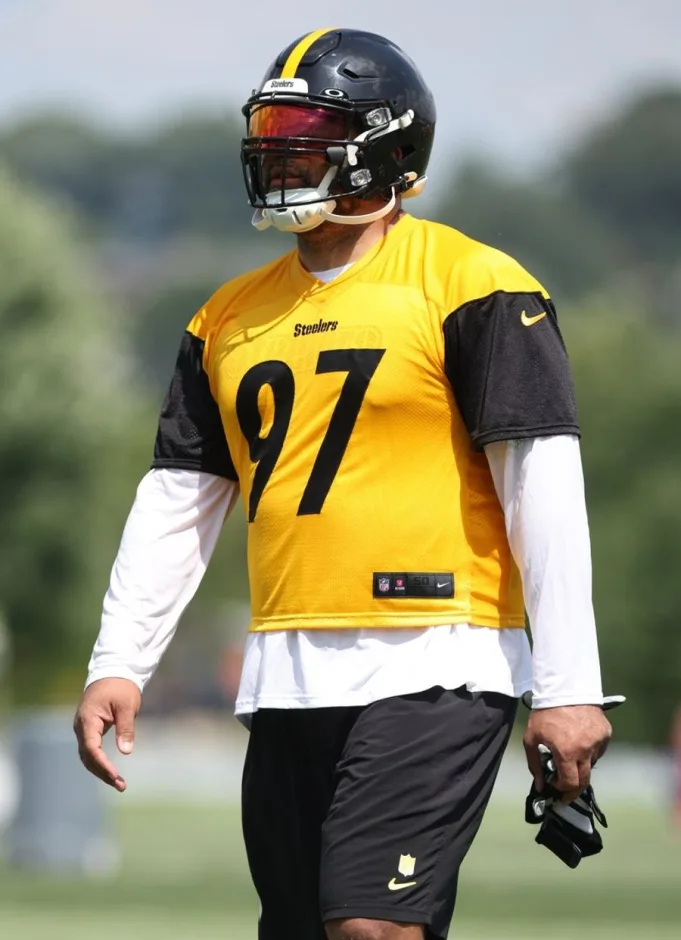 NFL: Kamp Pelatihan Pittsburgh Steelers 24 Jul 2025; Latrobe, , AS; Pittsburgh Steelers Defensive End Webcam Heyward (97 berpartisipasi dalam latihan selama kamp pelatihan di Saint Vincent College. Kredit Wajib: Gambar Charles Leclaire-Imagn