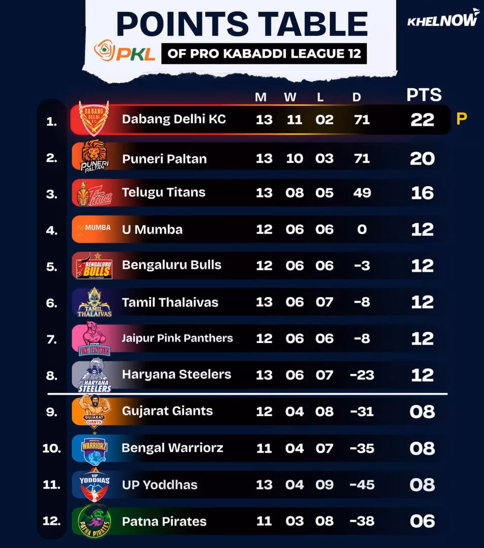 Dabang Delhi terus memimpin klasemen PKL 12 dengan 22 poin meski kalah malam ini. Puneri Paltan tetap kedua dengan 20 poin, dan Telugu Titans menempati posisi ketiga dengan 16 poin.