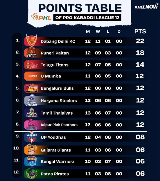 Pada Liga Pro Kabaddi musim ke- 12 (PKL 12, dua pertandingan luar biasa dimainkan pada tanggal 7 Oktober. Pada pertandingan pertama, Tamil Thalaivas mengalahkan Bajak Laut Patna 56 – 37 dalam pertandingan satu sisi. Setelah pertandingan kedua imbang 33 – 33, Dabang Delhi mengalahkan Haryana Steelers di tie breaker dan mencatatkan kemenangan ke- 11 mereka.