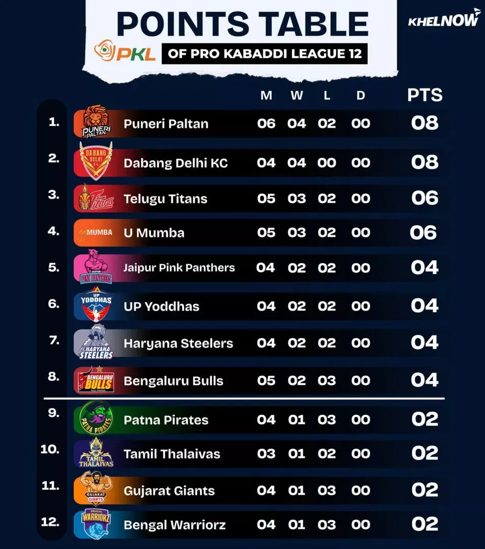 Tamil Thalaivas dan Gujarat Giants masing -masing berada di peringkat kesepuluh dan kesebelas, dengan masing -masing dua poin. Bengal Warriorz duduk di bagian bawah meja dengan hanya dua poin.