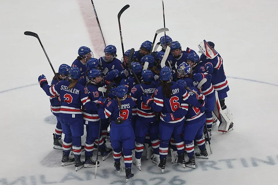 Tim AS merayakannya setelah mengalahkan Swedia di semifinal hoki es putri di Olimpiade Musim Dingin Milano Cortina 2026/ Kredit: Mattia Martegani/NurPhoto melalui Getty Images