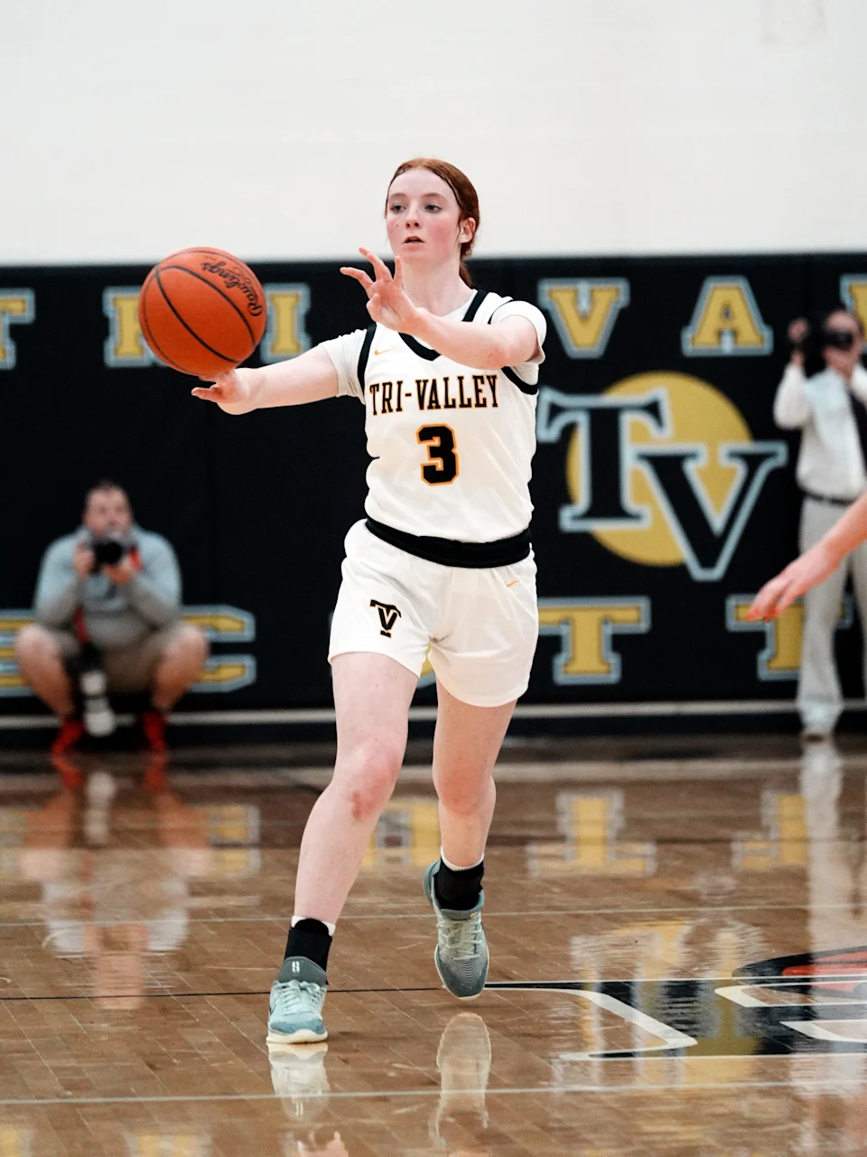 Maddie Garber mengoper bola ke atas lapangan saat Tri-Valley menang 44 – 22 melawan tim tamu New Philadelphia dalam pertandingan turnamen Divisi III Distrik Timur pada Rabu, 18 Februari 2026, di Dresden. Garber mencetak tujuh dari 12 poinnya dalam laju 10 – 3 pada kuarter ketiga saat Scotties maju melawan Zanesville untuk mendapatkan tempat di semifinal.