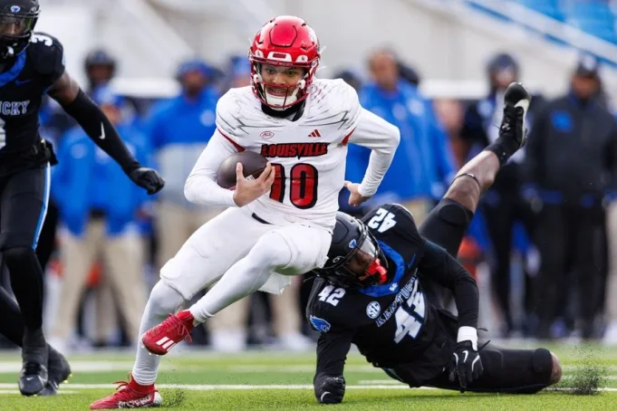 NCAA Football: Louisville di Kentucky 30 Nov 2024; Lexington, Kentucky, AS; Quarterback Louisville Cardinals Pierce Clarkson (10 menjalankan bola selama kuarter keempat melawan Kentucky Wildcats di Kroger Area. Kredit Wajib: Gambar Jordan Prather-Imagn