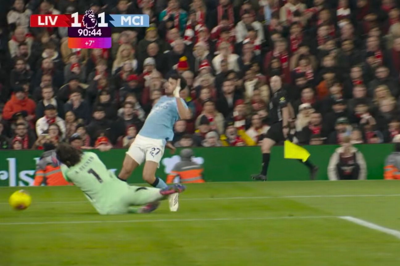 Apa yang telah terjadi : Dengan kiper Liverpool di lini depan dan mengejar gol penyeimbang, penyerang Manchester City Rayan Cherki memukul bola ke arah gawang yang kosong. milik Male City Erling Haaland dan pemain Liverpool Szoboszlai berkompetisi dalam perlombaan satu lawan satu untuk merebut bola, perlombaan yang tampaknya pasti akan dimenangkan oleh Haaland.