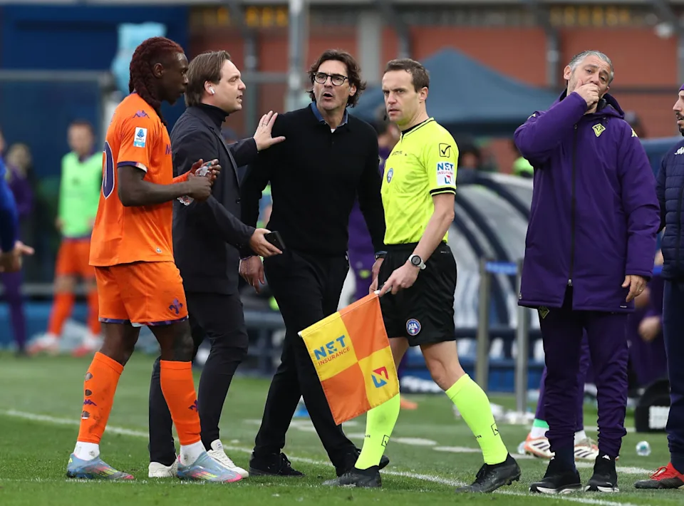 COMO, ITALIA– 14 FEBRUARI: Pelatih ACF Fiorentina Paolo Vanoli bereaksi setelah mendapat kartu merah pada pertandingan Serie A antara Como 1907 dan ACF Fiorentina di Stadion Giuseppe Sinigaglia pada 14 Februari 2026 di Como, Italia. (Foto oleh Marco Luzzani/Getty Images)